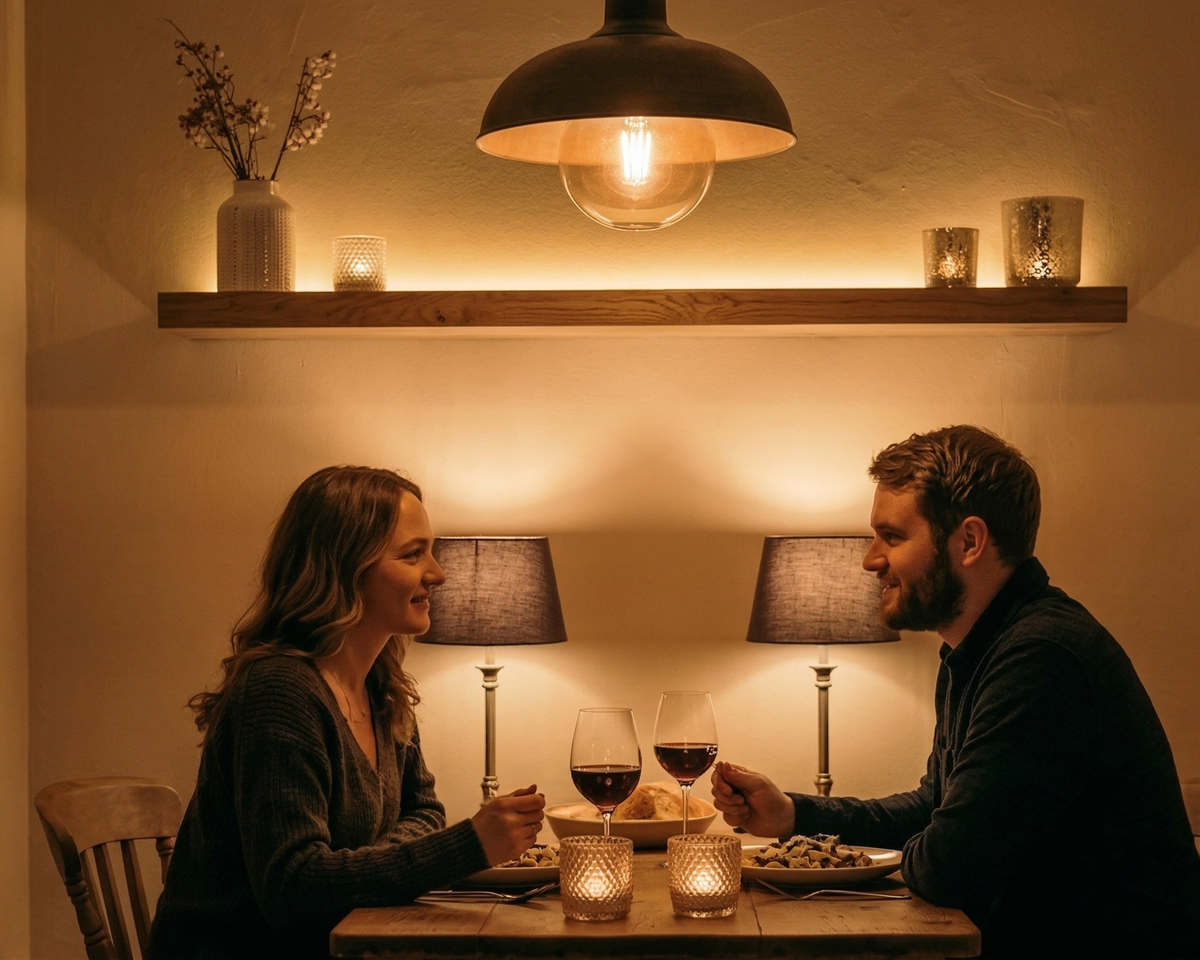 Jeśli planujesz romantyczną kolację w jadalni, unikaj oświetlania całego pomieszczenia. Skup strumień światła wyłącznie na blacie stołu. Doskonale sprawdzą się tu lampy wiszące z pełnymi kloszami, które kierują blask w dół, pozostawiając resztę pokoju w przyjemnym, tajemniczym półmroku. Taki zabieg tworzy optyczną wyspę, która naturalnie zbliża do siebie siedzące przy stole osoby. Niezwykle przydatne okazują się również ściemniacze do lamp LED. Dzięki nim możesz w ułamku sekundy płynnie regulować natężenie światła, dopasowując je do danej chwili. Jeśli nie masz włączników ze ściemniaczem w ścianie, świetnym i szybkim rozwiązaniem będzie inteligentne sterowanie oświetleniem. Wystarczy wkręcić żarówki typu smart, aby móc kontrolować jasność i temperaturę barwową prosto z ekranu smartfona.